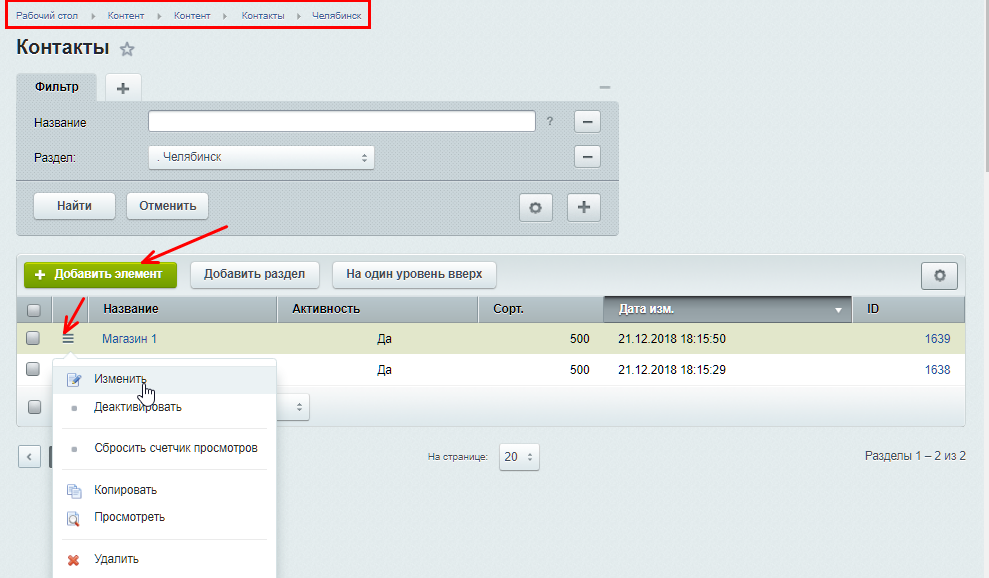 Для управления картой на линейке решений INTEC:Universe и MaTilda перейдите в административную часть сайта в Контент → Контакты. Откройте папку региона, для которого требуется установить новое положение точек на карте. Чтобы изменить положение маркера уже существующего отделения, вызовите меню кнопки «Гамбургер» и выберите пункт «Изменить». Для создания новой точки на карте нажмите «Добавить элемент».